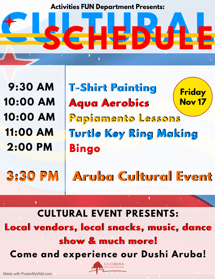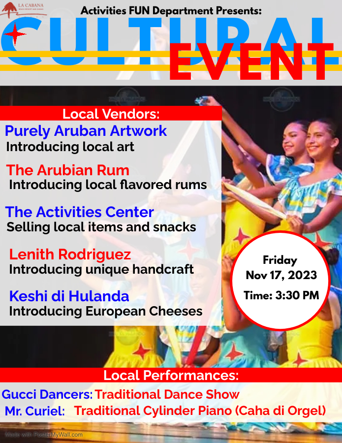 Our Fabulous Cultural Events Takes place every 3 months event featuring local traditional music, dancing, local drinks and snacks, providing an authentic and enjoyable immersion into Aruban culture